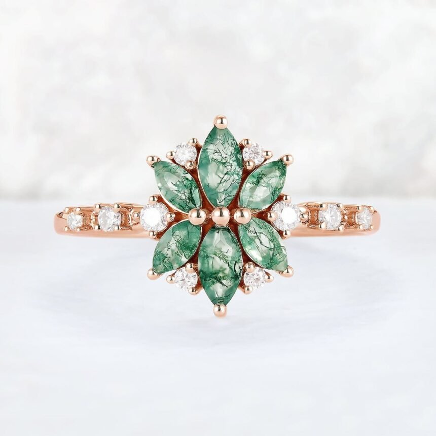 Moss agate rings also pair beautifully with different metals such as gold, rose gold, and silver. Whether designed in a vintage style or a modern minimalist setting, the gemstone adapts easily to various designs.