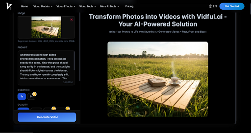 As a content creator, turning photos into high-quality videos used to be a time-consuming challenge. I often spent hours manually editing, trying to find the right transitions and effects to make my content stand out. That was until I found Vidful.ai, an AI image to video generator that changed my workflow. With just a few clicks, I can now convert photos to video in minutes, letting the AI handle the complex work of maintaining quality and creating smooth, engaging videos.